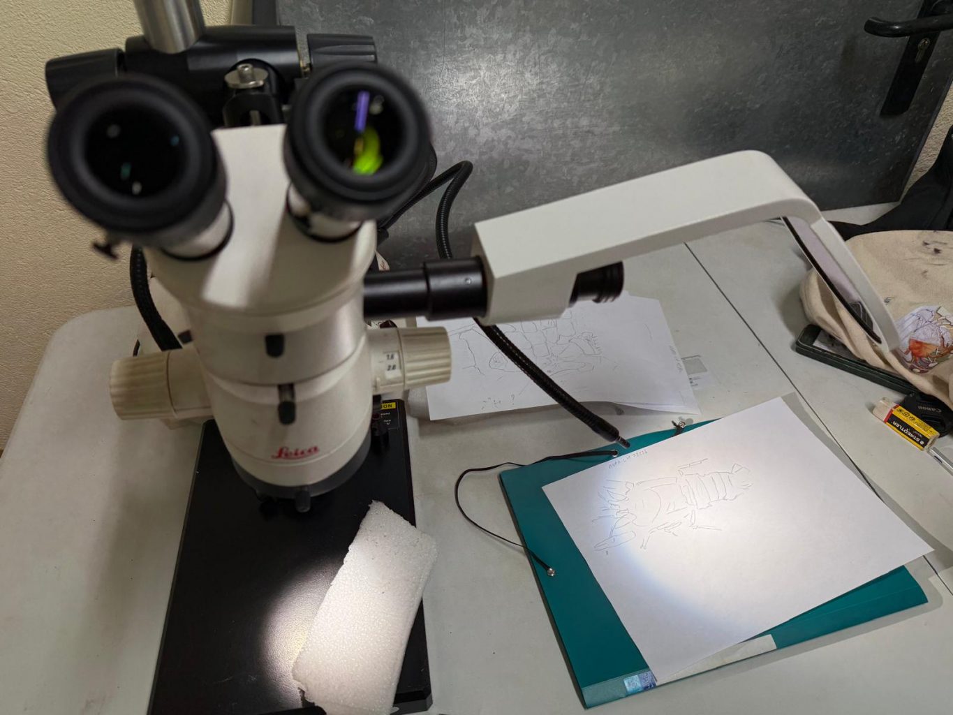 Estos días hemos recibido la visita del investigador Denis Audo, del Museo de Historia Natural de París, quien ha venido a estudiar de primera mano nuestra extraordinaria colección de cangrejos fósiles de Las Hoyas. Durante su trabajo en nuestras instalaciones, Denis ha realizado dibujos en cámara clara y fotografías con luz ultravioleta, técnicas que permiten revelar detalles ocultos y reconocer caracteres diagnósticos esenciales.